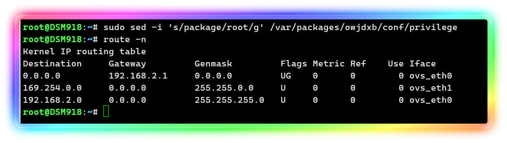 sudo sed -i 's/package/root/g' /var/packages/owjdxb/conf/privilege