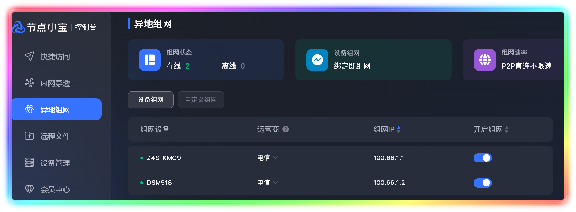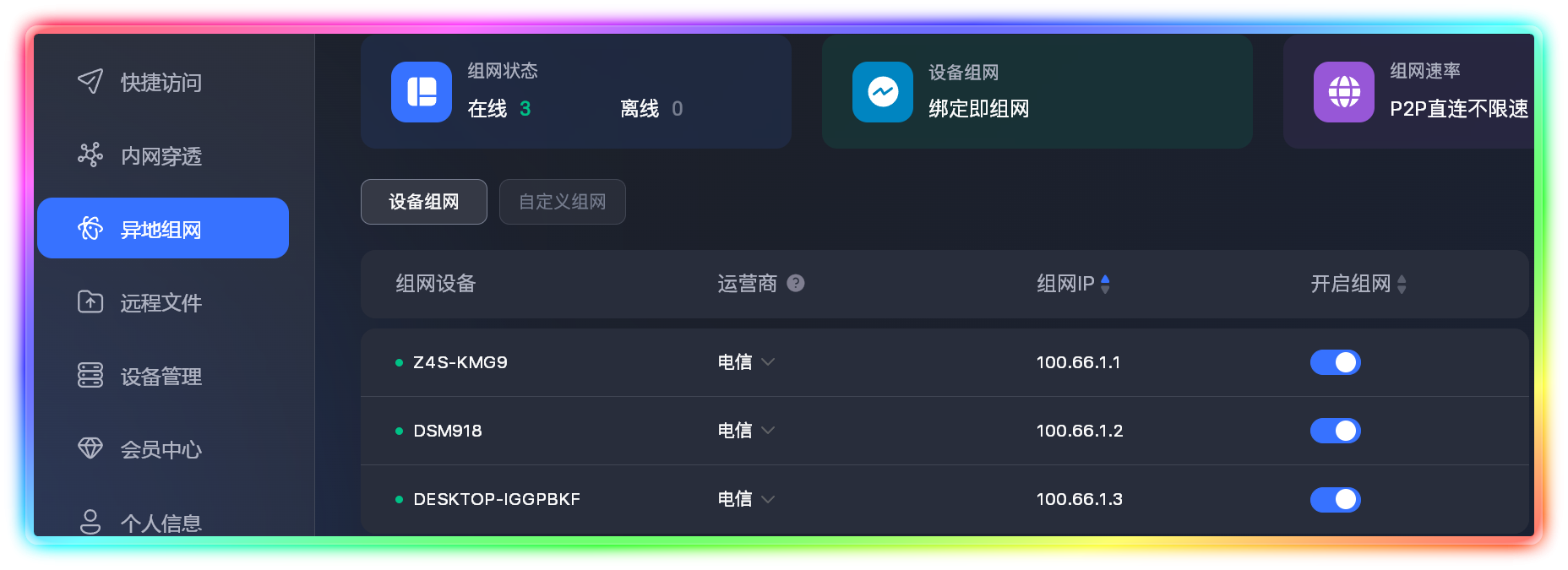 然而,实际使用后才发现其真正的核心优势:它不仅提供了高速稳定的连接,更把异地组网、远程文件访问这种高阶操作,变得像点几下鼠标一样简单。速度快、超稳定,关键是傻瓜式操作,省心到家。这种“不动脑”的省心体验,不仅对新手极其友好,即便是像我这样的资深用户,也有种用了就离不开的感觉。