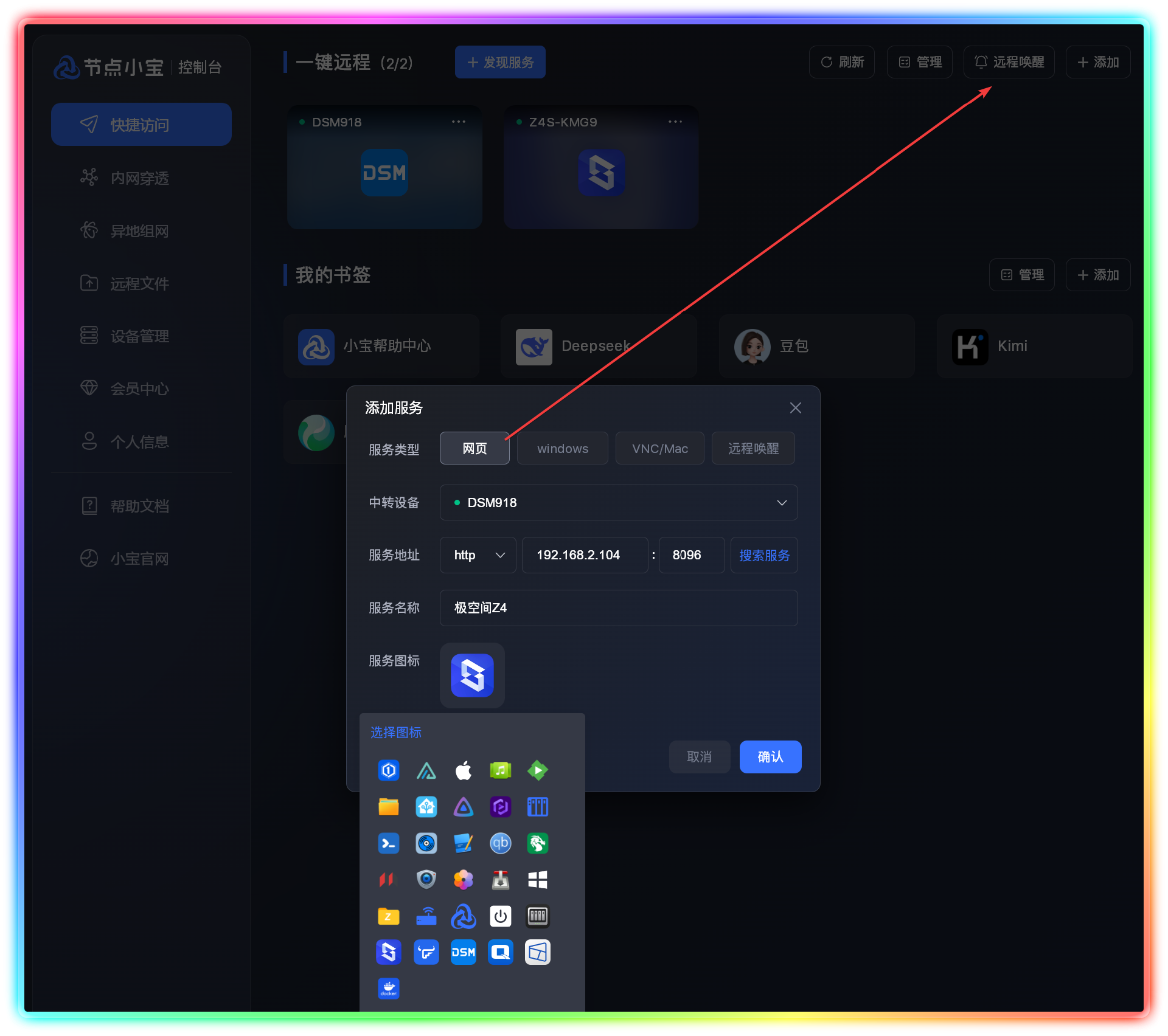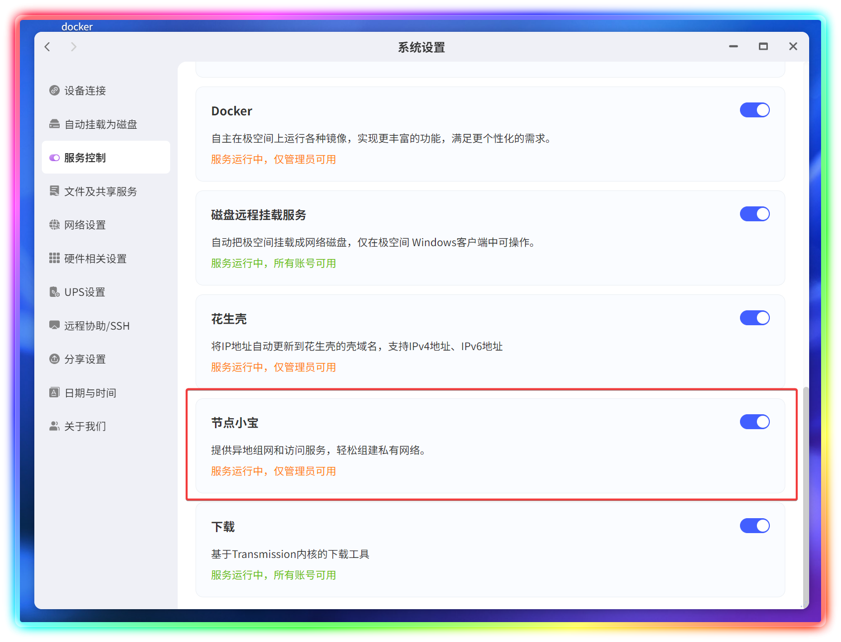 极空间是最简单的,直接系统就内置了节点小宝,只需要在服务控制中打开即可。