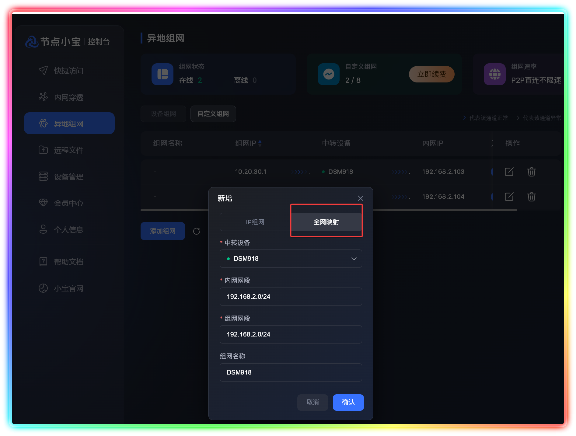 进入 异地组网 -> 自定义组网 -> 添加组网,全部默认即可。