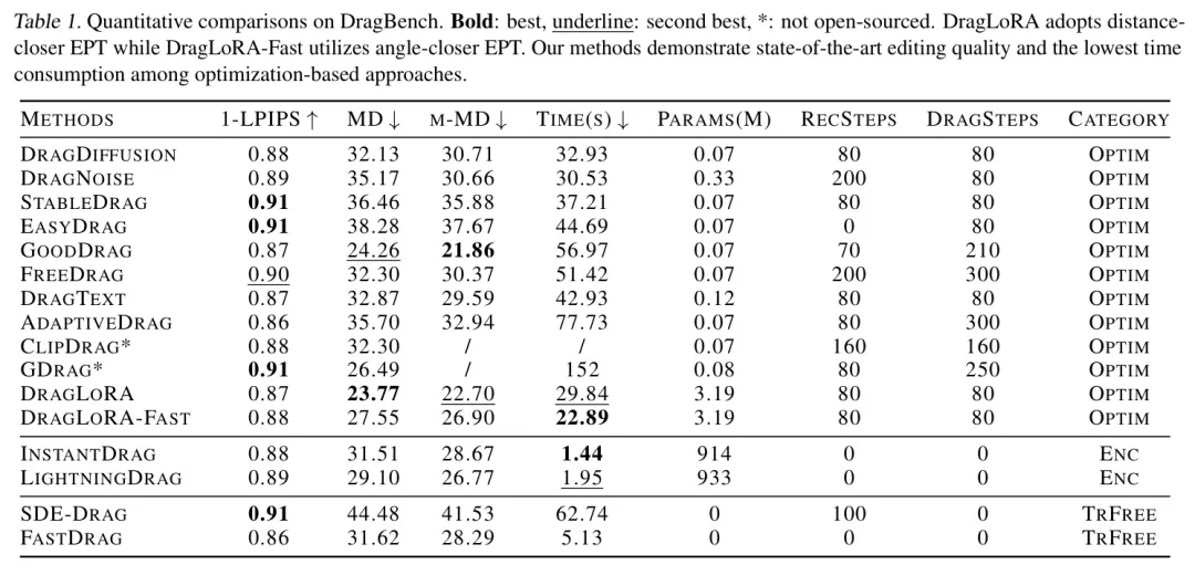 为了与更多方法(Cui et al., 2024; Hou et al., 2024; Ling et al., 2024; Choi et al., 2024; Chen et al., 2024; Jiang et al., 2024; Lin et al., 2025; Shin et al., 2024; Shi et al., 2024a; Nie et al., 2024; Zhao et al., 2024)进行进一步比较,作者在DragBench上进行了度量评估。作者使用了其他工作的公开代码,除了ClipDrag(Jiang et al., 2024)和GDrag(Lin et al., 2025),后者未开源其代码。作者将所有拖拽方法分为三类:基于优化(Optim)、基于编码器(Enc)和无训练(TrFree)。作者基于DragDiffusion(Shi et al., 2024b)测试了DragText(Choi et al., 2024)。作者评估了可训练参数数量、预训练重建LoRA所需的步数、在线优化的最大步数以及相关时间。请注意,由于重建LoRA可以离线训练并在多个拖拽编辑中复用,通过不同标注的点,因此该过程花费的时间不包括在内,在单个NVIDIA 4090 GPU上,每张图像超过80步大约需要48秒。由于EasyDrag(Hou et al., 2024)需要更多计算资源,作者单独在单个NVIDIA A40 GPU上对其进行了评估。