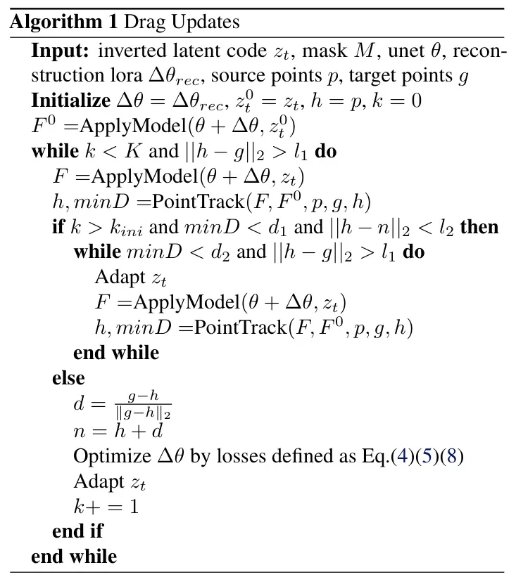 为了平衡效率与鲁棒性,作者基于点跟踪质量,提出了一种自适应切换方案(ASS),在两种模式之间切换:DOO加ILFA和仅ILFA模式。在仅ILFA模式下,DragLoRA更新潜在特征以引导控制点到达目标位置。当点跟踪定位到一个具有足够小最小距离minD(定义于公式7)的置信控制点,且该点距离时间目标足够近时,仅ILFA模式被激活。然而,在遮挡或纹理模糊等挑战性情况下,点跟踪可能会退化,需要进一步精炼。在这种情况下,DOO加ILFA模式开始,利用基于梯度的目标调整LoRA参数并稳定变形。这确保了即使在困难场景中,控制点也能保持精确位置。所提出的ASS根据点跟踪质量动态在这两种模式之间切换。这种自适应方案使DragLoRA能够高效处理各种场景,同时保持鲁棒性。其详细信息在算法1中给出。