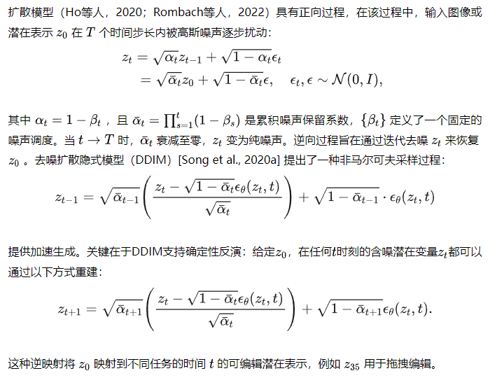 扩散模型在图像编辑中的应用。扩散模型最初设计用于像素域的迭代去噪,后来通过在潜在特征空间中操作进行加速(Rombach等人,2022)。在大型图像-文本数据集上训练后,Stable Diffusion可以根据输入文本生成高质量图像。这些模型能够实现各种图像编辑任务,几乎无需额外的训练。通常,源图像被噪声处理到适合编辑的中间时间步长,然后使用目标条件进行去噪以修改内容。SDEdit(Meng等人,2022)在DDPM调度后直接应用随机噪声,而DDIM反演(Song等人,2020a)及其High-Level版本(Mokady等人,2023;Miyake等人,2023)已被证明能更好地保留源图像的细节。
