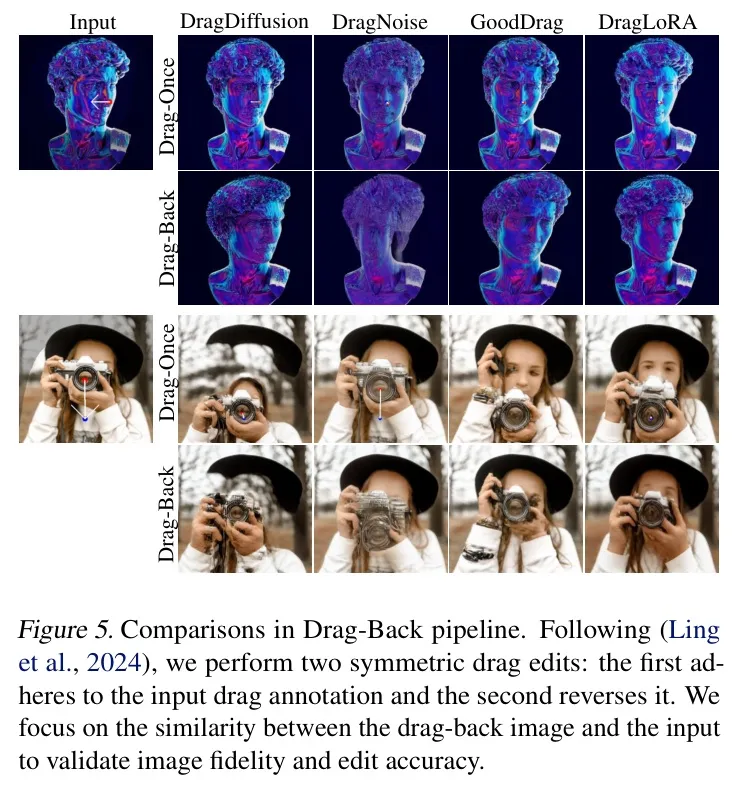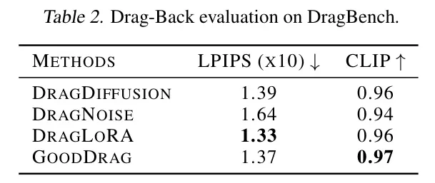 拖回评估:随着编辑程度的增加,1-LPIPS自然地下降。特别是在进行重大编辑的情况下,它无法反映一致性。遵循(Ling等人,2024),作者采用拖回流程同时测量可编辑性和一致性。在完成一轮编辑后,作者在编辑后的图像上训练一个重建LoRA,交换源点和目标点,并执行第二轮拖回编辑。通过LPIPS和CLIP(Radford等人,2021)测量第二次编辑图像与原始图像之间的差异。CLIP指标计算CLIP图像编码器从两张图像中提取的特征的相似性。如图5和表2所示,较低的LPIPS和较高的CLIP表明两轮拖回编辑有效地保留了原始图像信息,同时也表明第一轮编辑将图像充分地接近目标。作者的DragLoRA在视觉和定量上都实现了更好的拖回结果。