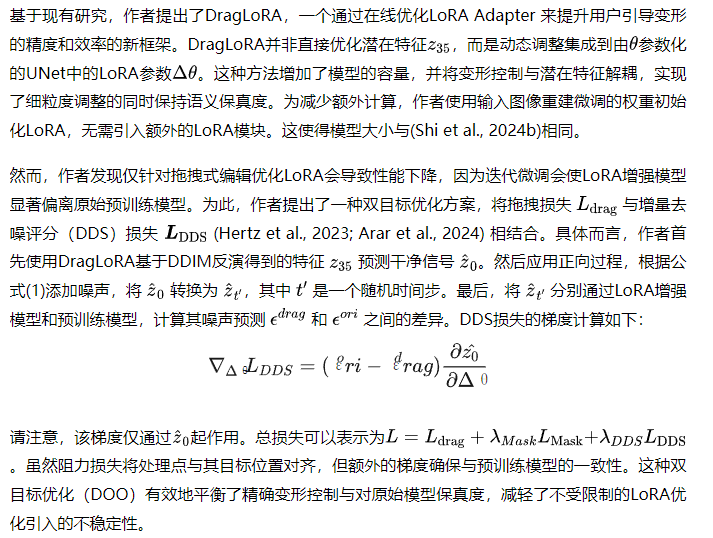 作者提出了DragLoRA,一种参数化 Adapter ,能够根据用户的交互进行在线优化。通过用动态模型适应替换直接潜特征优化,DragLoRA增强了细粒度变形能力,同时保留了预训练的扩散先验。作者引入了一个双目标框架,结合了拖拽损失与DDS损失,通过比较原始Unet和LoRA增强Unet在扰动特征上的噪声预测来计算。结合循环去噪-重噪过程,该过程迭代地将控制点调整传播到潜空间,这一框架确保了与源图像的语义一致性,并通过累积变形轨迹稳定运动监督。