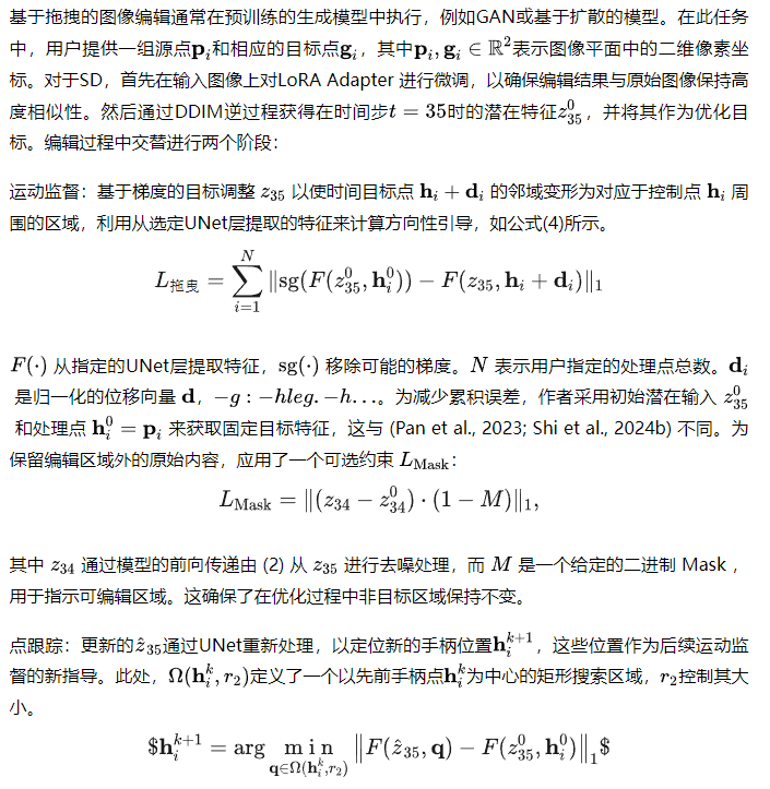 基于拖拽的图像编辑技术使用户能够在预训练的生成模型中进行直观的点驱动操作。通过指定源点和目标点的配对,用户可以交互式地引导物体变形,迭代地将内容从源位置“拖拽”到目标位置。这些方法通常通过两个连续的阶段进行操作:运动监督,该阶段计算方向梯度以使特征与期望的运动对齐,以及点跟踪,该阶段根据不断演化的特征空间更新控制点位置。尽管这种范式减少了对外部复杂文本或参考输入的依赖,但现有方法在精度和效率方面通常存在挑战。直接优化潜在特征(如DDIM反转表示)由于运动监督中特征表达能力的局限性而引入不稳定性,而迭代跟踪过程则因搜索大范围空间区域而带来高昂的计算成本。