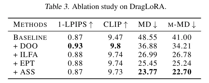 作者的 Baseline 方法首先基于DragDiffusion优化LoRA,而不是输入潜特征。由于LoRA的过度更新,图像发生了失真变化,导致性能不佳。应用DOO能有效稳定拖拽更新,提升LPIPS和CLIP表现。ILFA通过将输入特征的布局信息与LoRA权重对齐,有助于增强编辑精度。EPT和ASS主要设计用于提升效率。前者减轻了误差跟踪点带来的干扰,后者使训练过程更能适应多样化场景,从而也提高了可编辑性。更明显的结果可在附录B.4中找到。