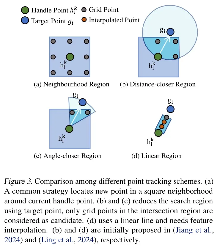 为进一步提升拖拽编辑的效率,作者研究了不同类型的控制点追踪策略,如图3所示。研究发现,DragLoRA能够有效缩小搜索区域,并且在效率方面优于传统方法。与传统邻近区域搜索不同,距离更近(Jiang et al., 2024)和角度更近的区域会约束控制点追踪的候选点,避免不必要的位置回退。具体而言,目标或当前控制点作为圆心,其与点的距离定义半径。只有位于圆(或扇形)与邻近区域交集内的网格点才会被考虑,用于与原始源点特征进行比较。Ling et al. (2024) 提出了一种更激进的搜索策略,该策略沿着控制点到目标点的直线进行搜索。在DragLoRA中,作者选择距离更近和角度更近的策略进行点追踪,前者性能最佳,后者效率最高。此外,为防止因点坐标快速变化导致优化不足,作者基于minD决定是继续优化还是保留上一个控制点。更多细节请参见附录B.3。