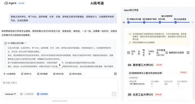 近年来,AI 搜索能力改变了信息获取与处理的方式,也更深入地应用于高考服务。与过往同类产品相比,最大的不同有两点。一是服务更加智能化。Agent运行的整个过程是自动化的,用户只需要输入基本信息,AI就能生成报考方案,并解释考量因素,提供决策指引。