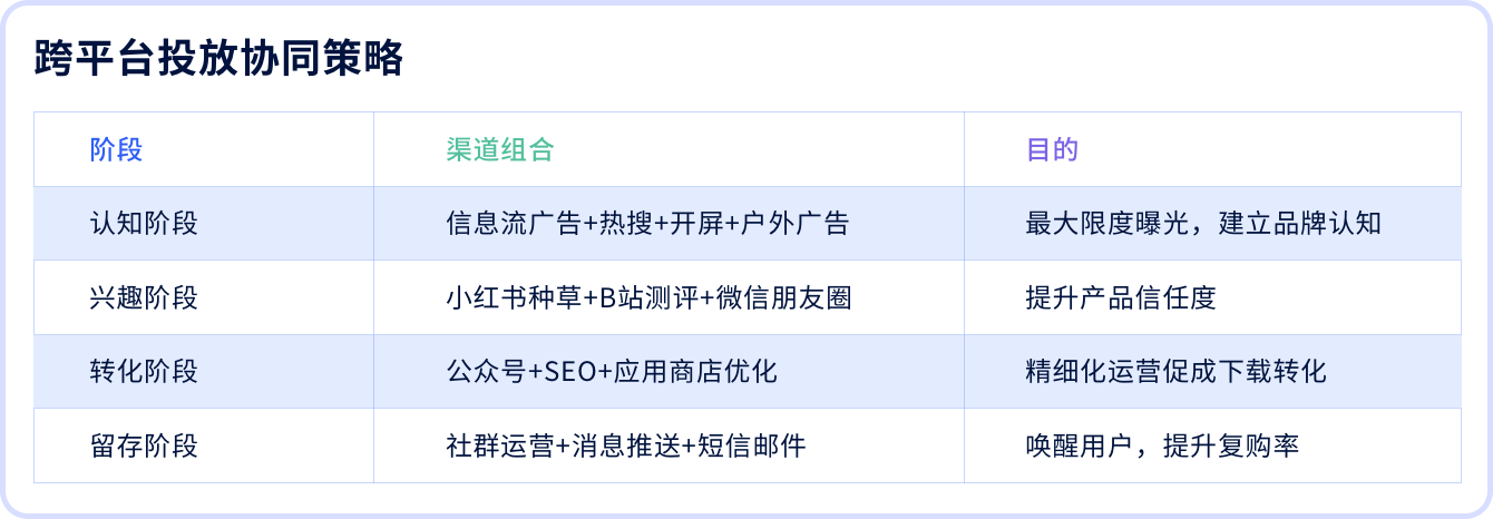 单一渠道的投放已无法满足复杂的用户旅程。成功运营需要将不同平台在用户生命周期的不同阶段进行有机结合: