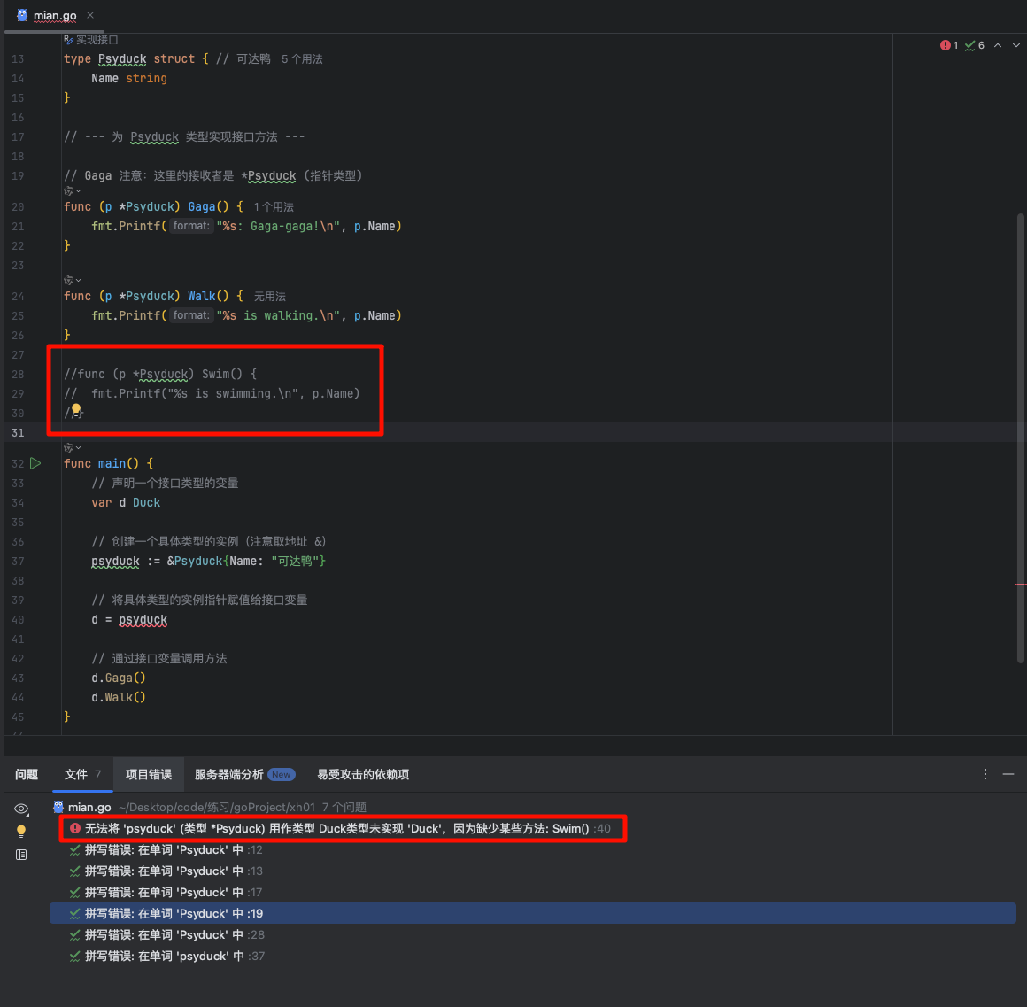 原因:因为方法是为指针定义的,Go 不会自动(也不能安全地)将你的值变量转换为指针来调用方法。它无法确定你期望在哪个实例上进行修改。