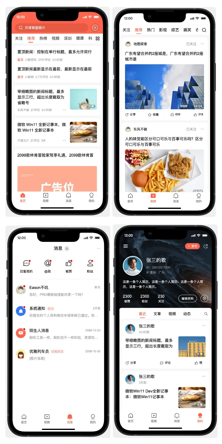 我大概分了四个模块,首页资讯模块,视频模块,消息模块和我的模块,最终的效果呈现,目前找了一个资讯App原型,大致如下,最后呈现的效果也尽量贴近原型设计。