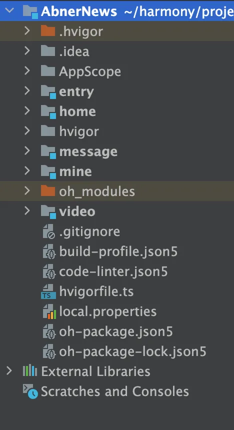一一创建完毕后,我们的项目,加上主模块entry,就存在了五个模块,效果如下: