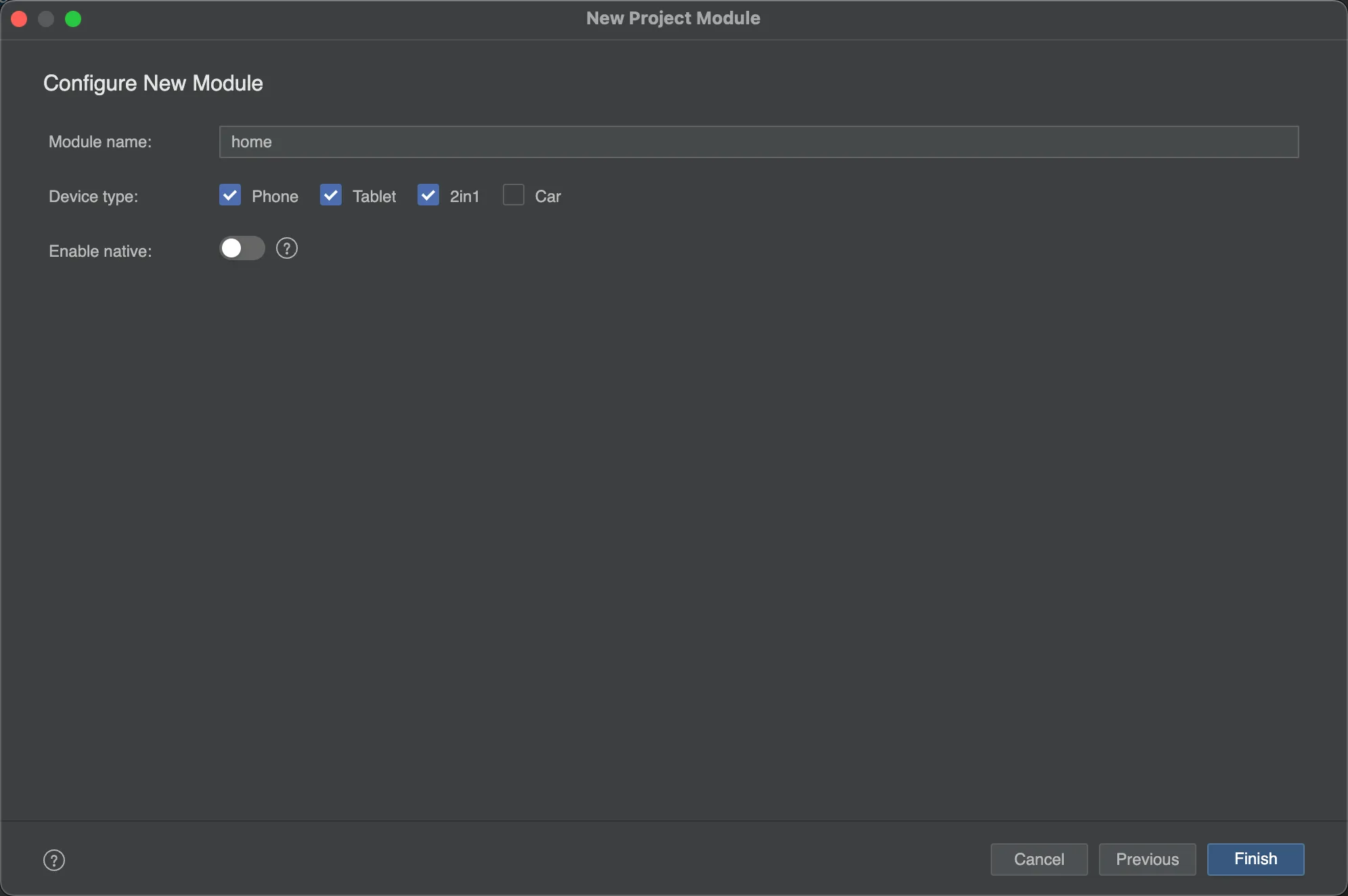 输入模块名字,四个模块,分为为首页模块home,视频模块video,消息模块message,我的模块mine;设备类型,根据自身需要进行选择。
