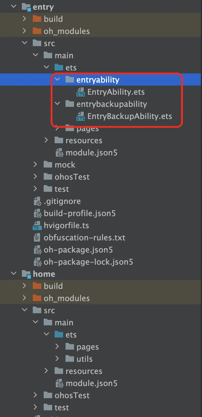 其实在module.json5中我们已经看出了这个差异,主模块中是多了两个Ability,一个是EntryAbility,一个是EntryBackupAbility,虽然说默认生成的自带EntryBackupAbility这个用于应用接入数据备份恢复的类,但是我们删除,也不会影响到我们的应用开发。
