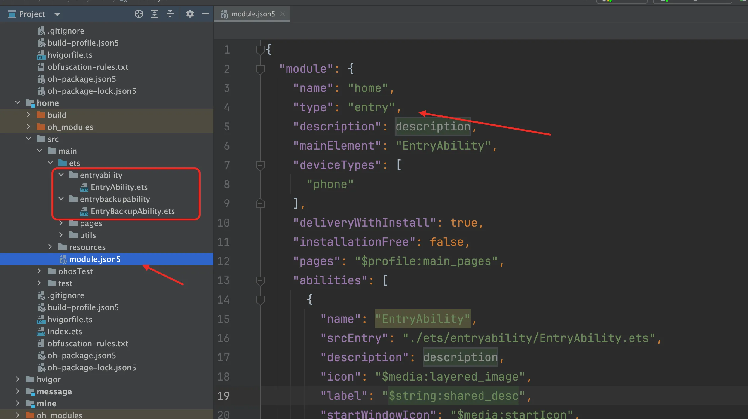 module.json5中也是改为和主模块一样的,并且需要两个Ability。