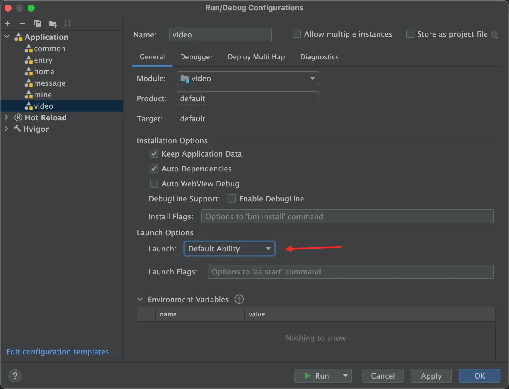 打开你要运行的模块,在Launch处,选择默认的Ability即可。