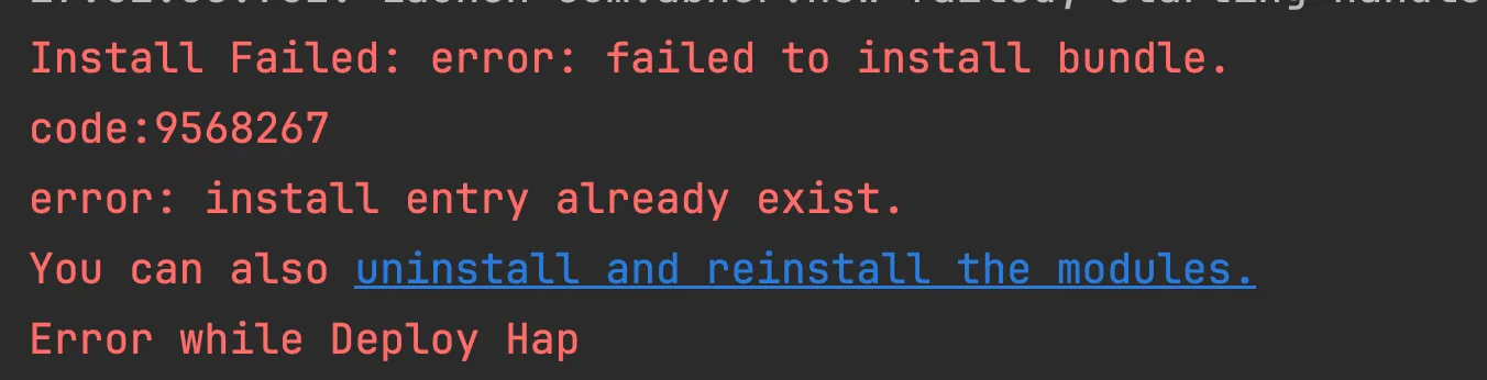 是因为,目前设备上已经有安装的同包名的应用了,直接点击蓝色的uninstall and reinstall the modules,即可解决。