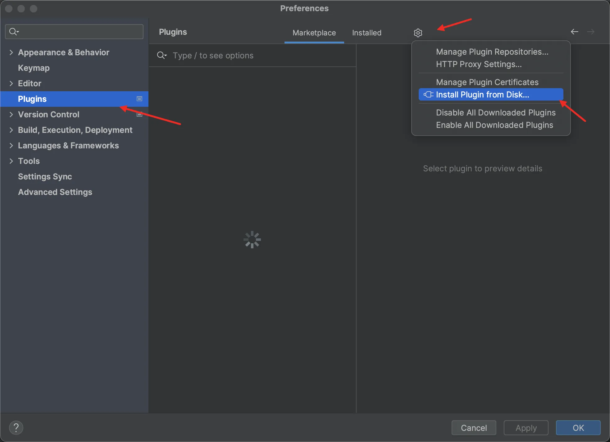 本地安装也是非常的简单,打开设置,点击左侧的Plugins,点击设置图标,点击本地安装,Install Plugin from Disk…,找到你下载好的插件,确定打开后,点击底部的应用即可,一般不需要重启IDE,如果未生效,您可以重启IDE。