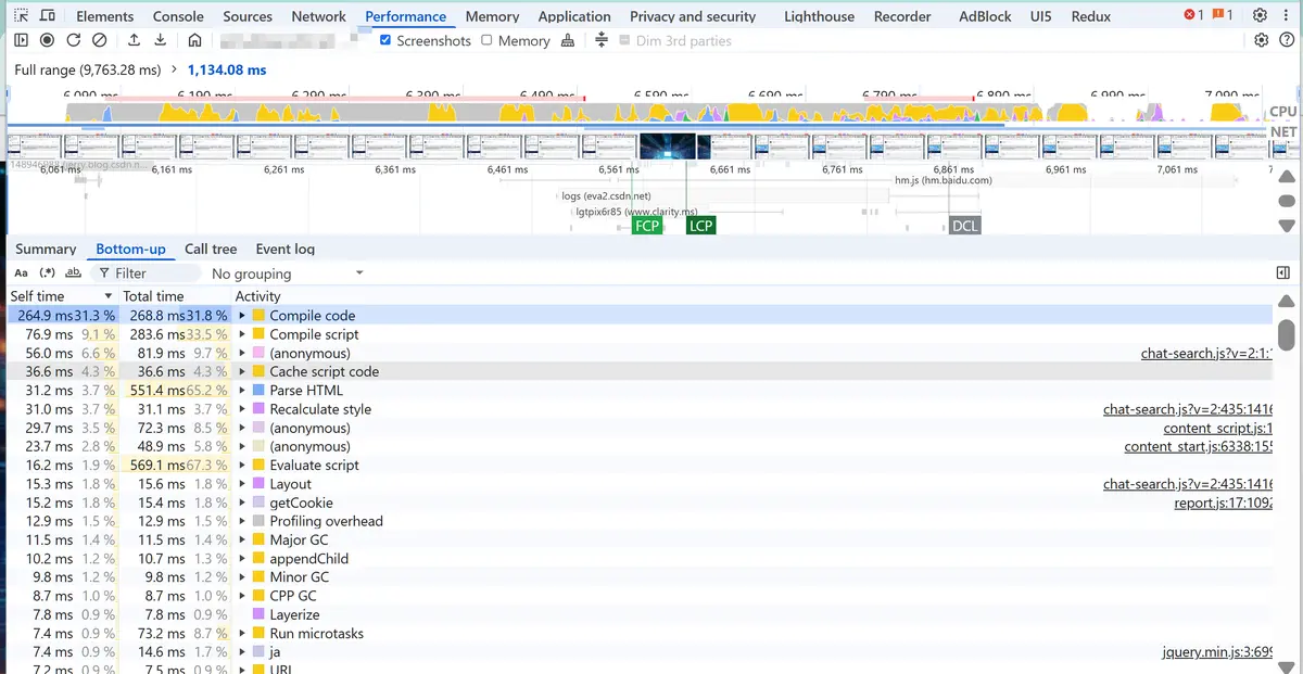 Chrome DevTools Performance 面板能录制页面生命周期中每一帧的 CPU 与 GPU 事件,并用火焰图展示调用栈深度,支持缩放与分层查看,有助于迅速发现主线程占用高的脚本段。