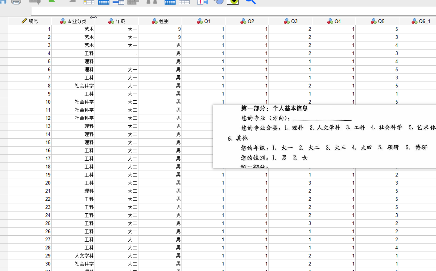 下面的这个是我们的这个具体的数据的打开的情况,需要清楚的是我们的这个SPSS目前是仅仅针对于这个数值类型的数据进行分析的,他目前是不支持对于这个文本类型的这个数据的分析;