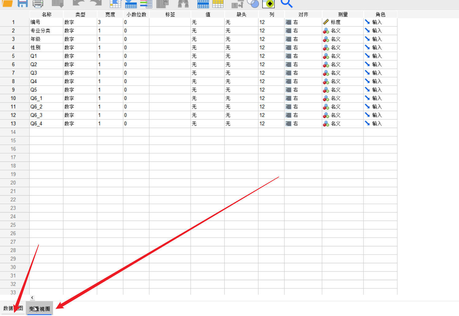 我们需要做的第一步操作就是切换到这个变量视图这个里面去:刚才的那个表格是属于数据视图,在这个变量视图里面对于我们的这个数据里面使用到的这个属性进行了相关的这个分类;