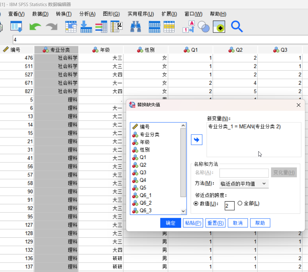 下面升序排列,缺失值会排到前面来,然后众数是社会科学,使用4填充缺失值的位置即可;