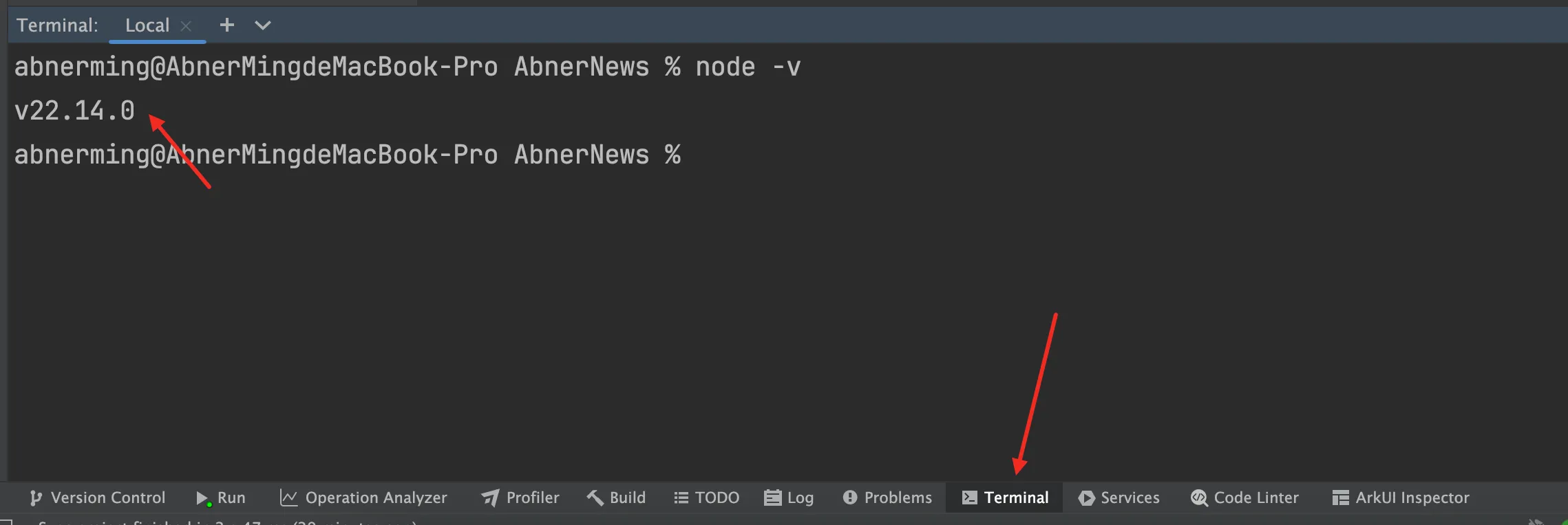 node start 模块名字鸿蒙开发是需要node环境的,一般不需要我们在额外配置,在下载DevEco Studio的时候会自行配置,为了验证node环境是否存在,我们可以在DevEco Studio底部终端,输入node -v,如果能正确显示出版本号,则有node环境。