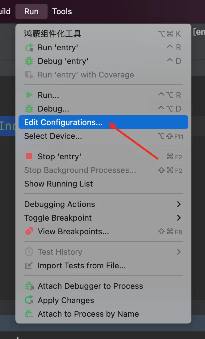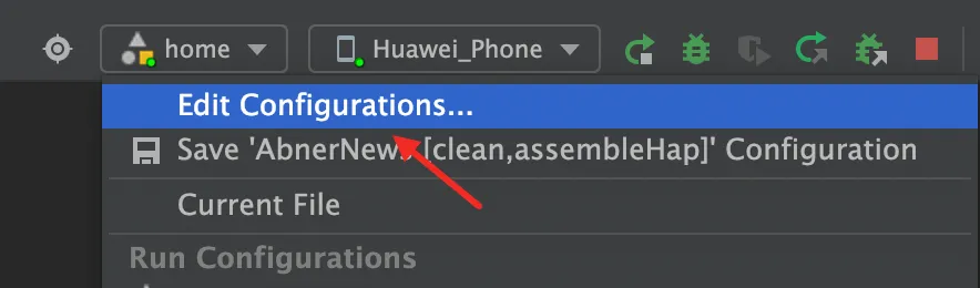 DevEco Studio中自带的node环境,我们可以点击顶部的Run菜单按钮,点击Edit Configurations…,如下图所示: