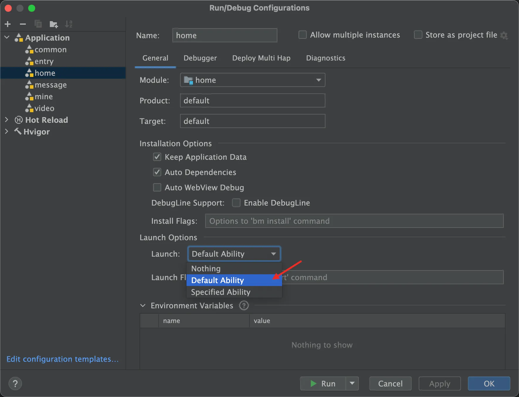 以上执行完之后,如果你的模块,没有设置默认的启动Launch,需要手动配置一次,仅第一次配置,如果已经配置了,则会直接运行到设备上。