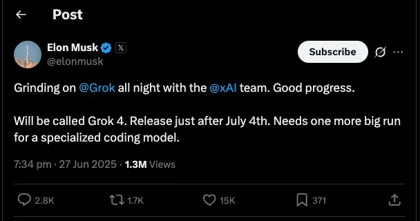而就在 50 分钟前,马斯克亲自在 X(原 Twitter)上发文预告:Grok-4 将于 7 月 4 日后发布。更值得关注的是,xAI 还将同步推出一款 专用编码模型,这是首次将 Grok 的能力延伸至软件工程领域。
