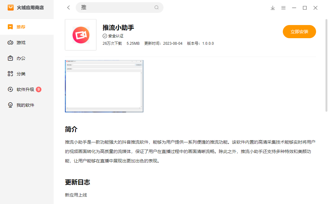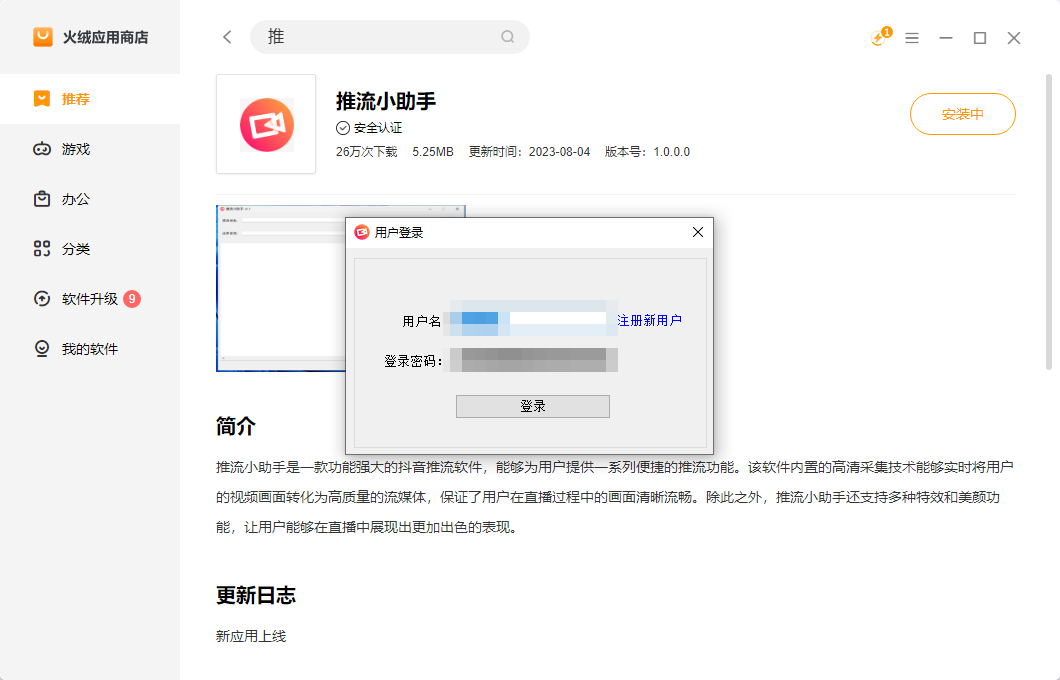 方案2、下载火绒应用商店,搜索推拉流小助手,安装应用,打开直播伴侣开启直播,通过改工具即可获取抖音的推流地址和推流码。