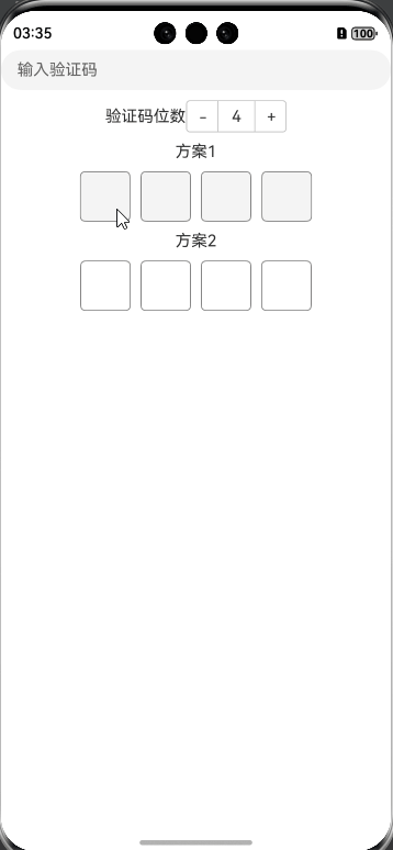 在应用使用手机号登录验证时,通常需要输入手机验证码4位或者6位,今天实现一个验证码输入的功能。以下,提供了2种实现方案: 第一种比较复杂,每个验证码输入框使用了一个TextInput,需要处理每个TextInput输入回调、删除回调,和焦点处理。 1.拦截输入前onWillInsert和删除前onWillDelete的回调函数,修改验证码的数据,将焦点给到为输入的下一个TextInput 2.输入框增加点击事件拦截,点击输入框定位焦点 第二种使用Text显示输入的验证码,在Text上放置了一个透明的TextInput用于接收输入数据,只需要将输入结果,分别显示到每个Text即可 看一下演示效果: