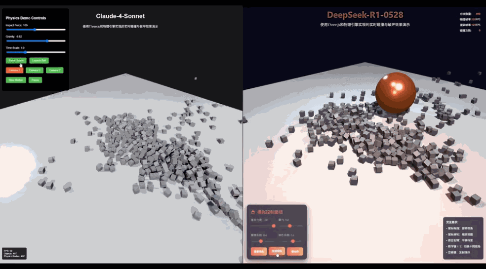 与Claude4对比:不管是光线照射在墙上形成的漫反射,还是球在撞击后的运动方向,R1胜: