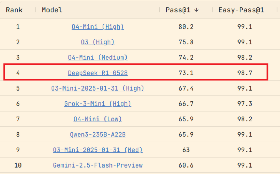 新的 Deepseek R1-0528 的性能几乎则直接和o4-mini、o3(High)差不多。