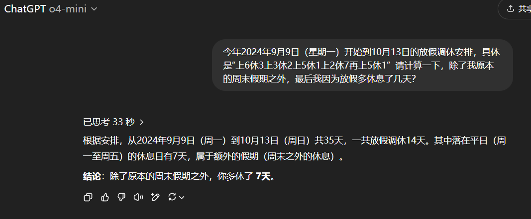 而o4-mini对这个任务也给出了错误的答案:7天