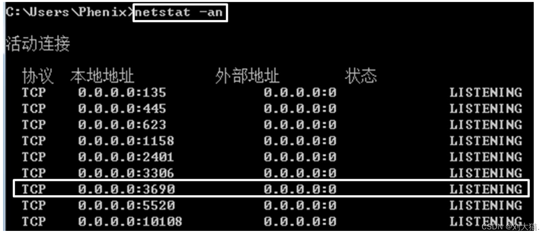 SVN 服务监听 3690 端口,打开一个新的 cmd 窗口,使用 netstat -an 命令查看 3690