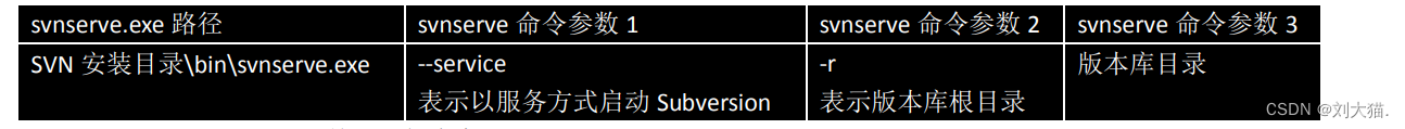 svnserve | -d 表示后台执行 | -r 表示版本库根目录 | D:\DevRepository\Subversion |