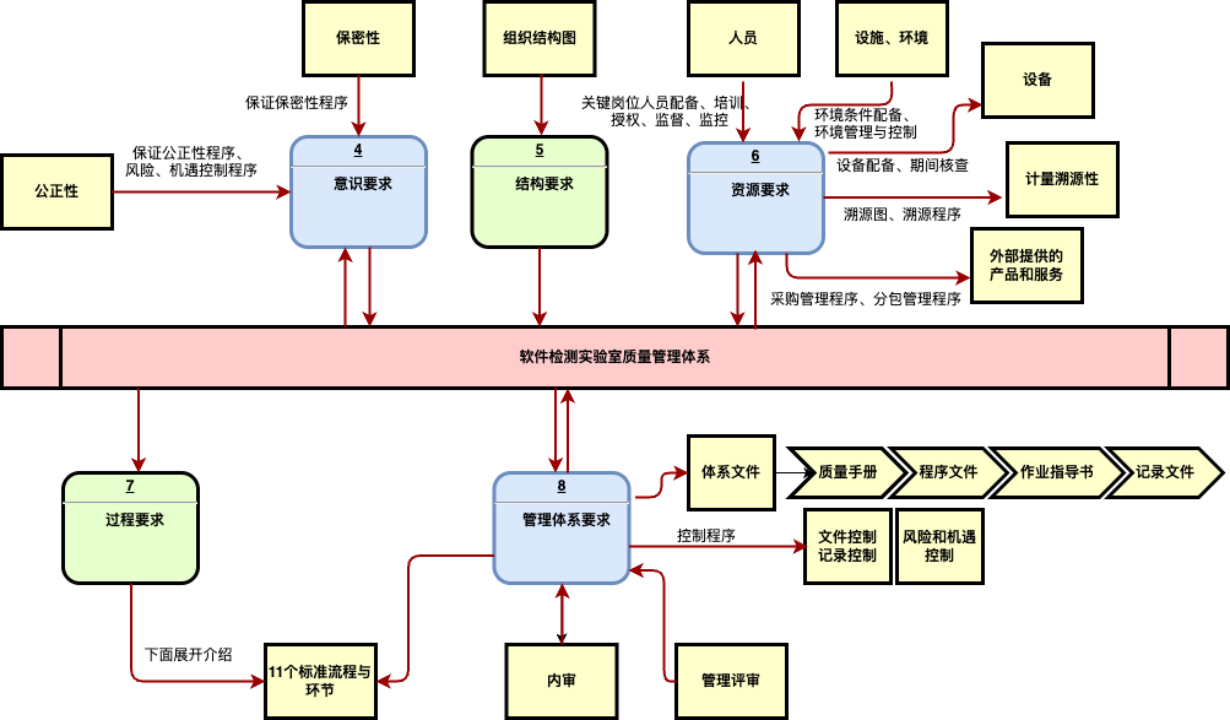 软件实验室在申请CNAS资质时,需要依据CNAS认可准则文件的要求,建立实验室质量管理体系。根据CNAS-CL01:2018文件,实验室质量管理体系大致可以分为五个部分,分别是意识要求、结构要求、资源要求、过程要求和管理体系要求。