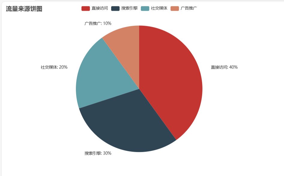 data = [("直接访问", 40), ("搜索引擎", 30), ("社交媒体", 20), ("广告推广", 10)]