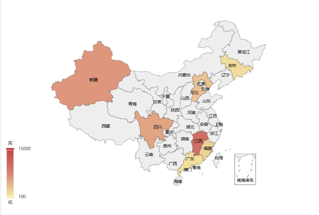 visualMap: {min: 100 , max: 15000 , text: ['高', '低'] , calculable: true},