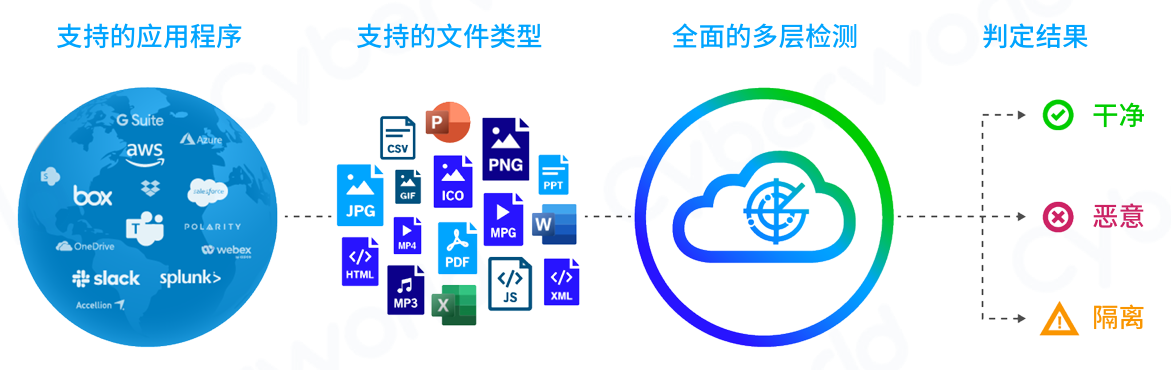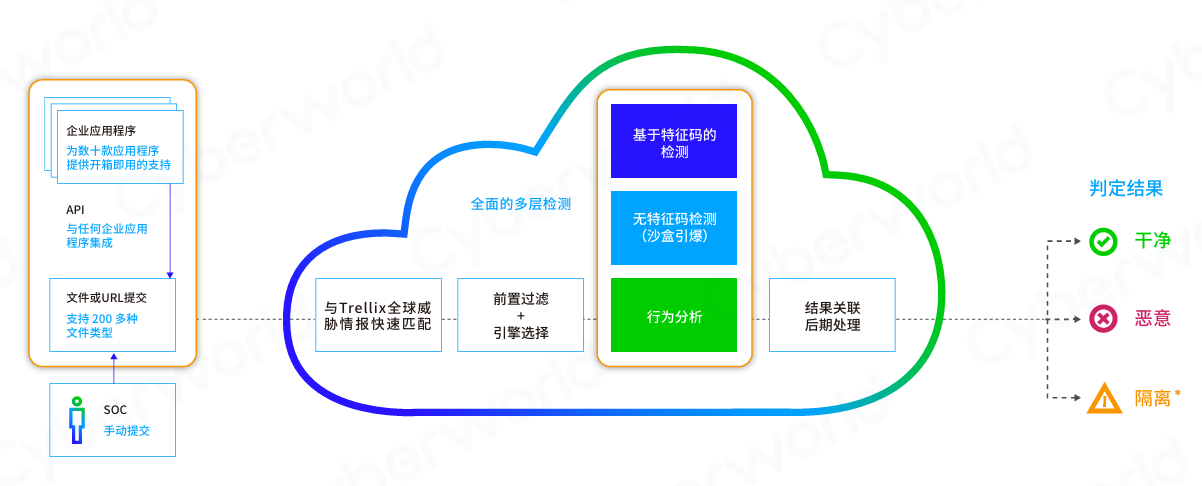 判定已知攻击和零日攻击,同时消除误报。多阶段的检查过程将 虚拟化和网络安全结合起来,准 确拦截用于渗透网络、窃取资源和敏感数据的高级恶意软件。
