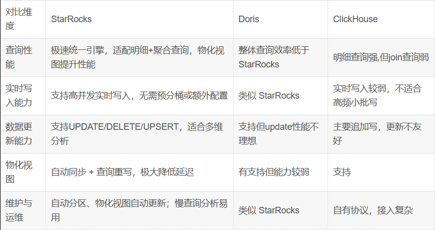 在调研和测试过程中,我们重点对比了 StarRocks 与 Doris、ClickHouse 等主流 OLAP 引擎,StarRocks 在多个方面表现更为突出,具体优势如下: