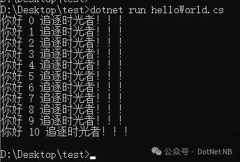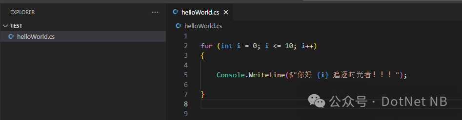接下来我们直接在 VS Code 中创建一个独立的 helloWorld.cs 文件,然后直接在 cmd 命令行工具中使用 dotnet run 运行: