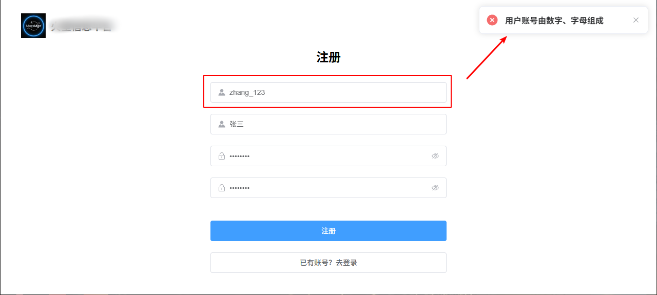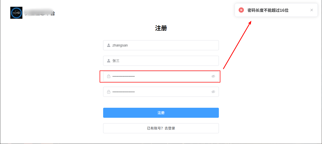 对请求参数校验,并在不符合要求时返回自定义错误信息。例如:在用户注册的时候,对用户名、昵称和密码进行校验,校验失败时返回自定义的错误信息。