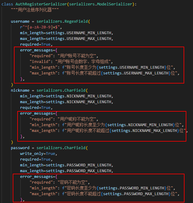 定义用户注册序列化器,用户请求参数校验失败时,返回自定义错误信息