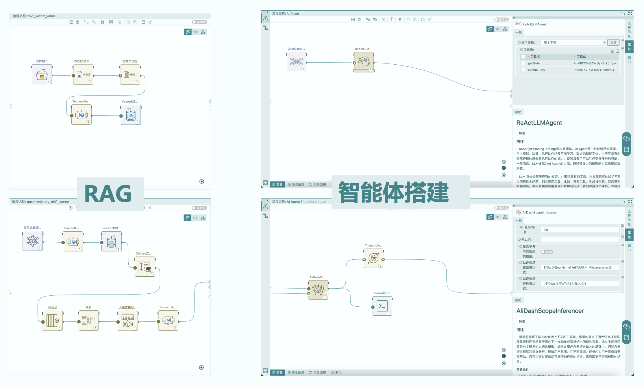 数据处理、模型训练都就绪后,最让人期待的就是构建智能应用。HuggingFists 提供了丰富的低代码工具和对大模型的全面支持,让大模型不再是「实验室玩具」,而是可以真正落地的「超级大脑」。