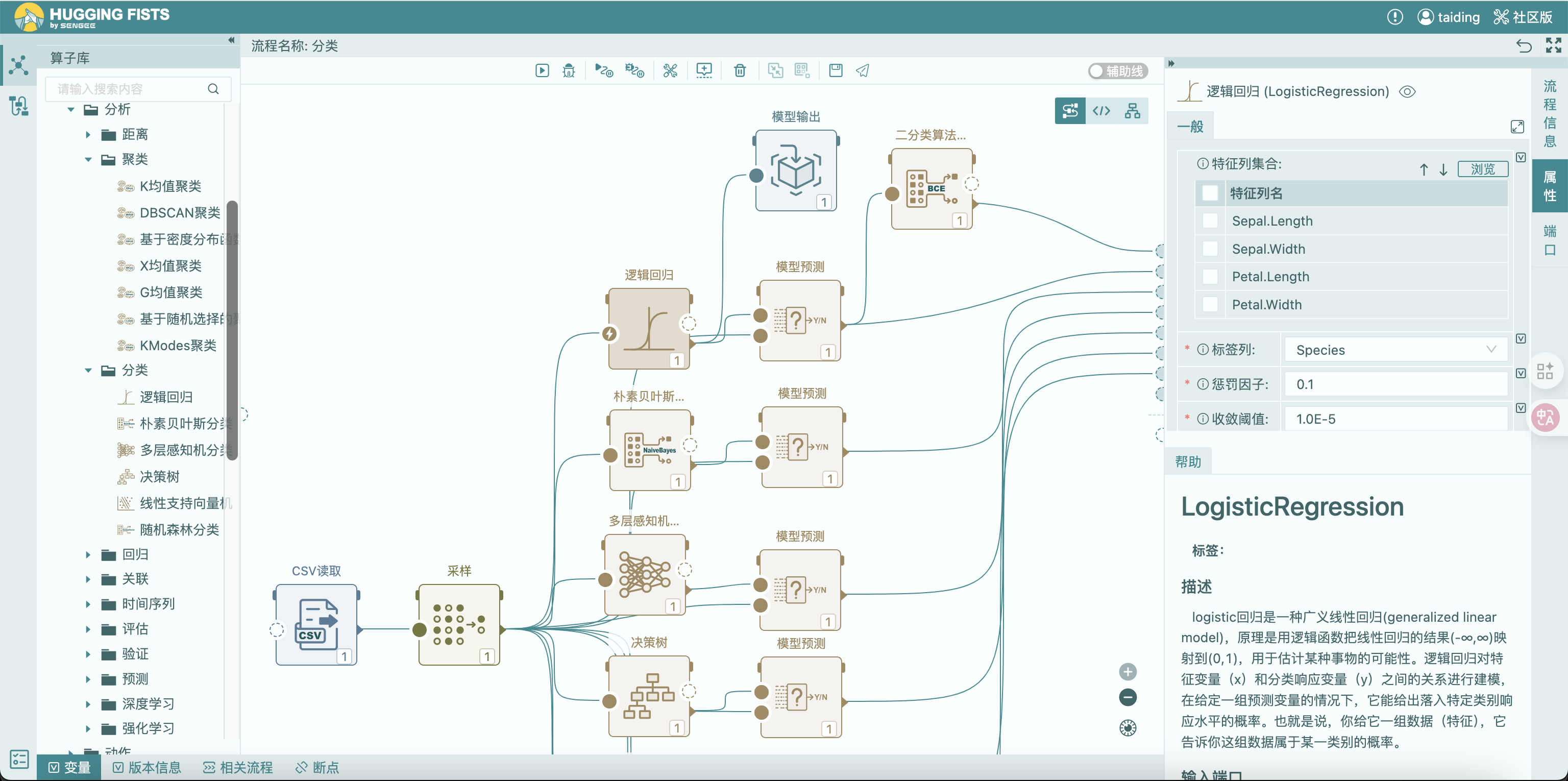 在完成了数据的整理后,HuggingFists还支持对数据进行挖掘分析,用于发现数据中的潜在价值。HuggingFists内置了包括:特征处理、聚类、分类、回归、时序、距离、关联等在内的几十种算法,方便使用者对数据进行模型训练、模型管理。并支持使用者利用训练好的模型进行业务环境的预测。