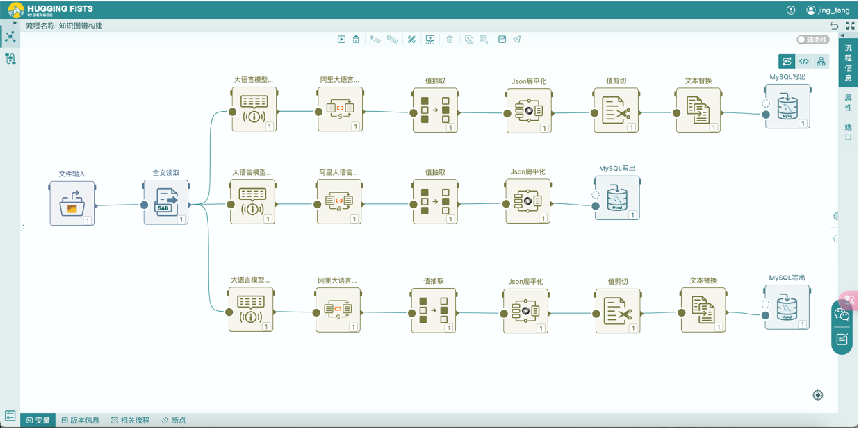 如上图所示,HuggingFists能够为数据的汇聚、处理、分析、训练、开发以及应用等多个环节提供低代码可视化的流程编写能力。在数据汇聚阶段,拥有同类能力的工具有Kettle、StreamSet等;在模型训练阶段,拥有同类能力的工具有RapidMiner、KNIME、SPSS等;而在应用开发阶段,目前以AI低代码开发工具为代表,有如Flowise、Langraph、Dify、RagFlow、n8n等。HuggingFists为以上各阶段提供了一个统一的流程编写解决方案,用于降低使用者的学习成本,提升工作效率。