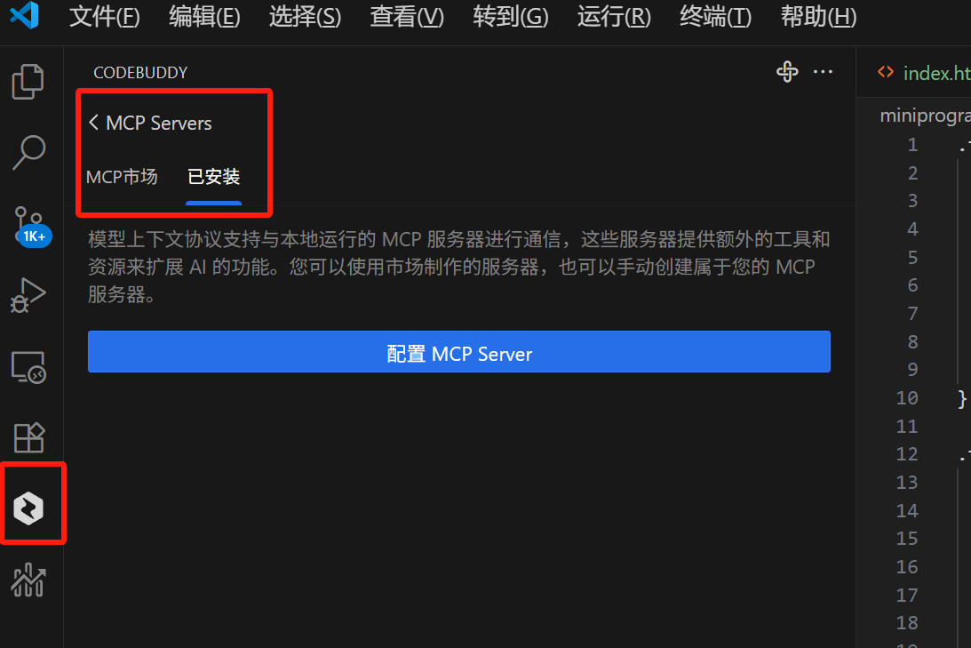 然后在codebuddy助手中,找到MCP市场,然后安装CloudBase